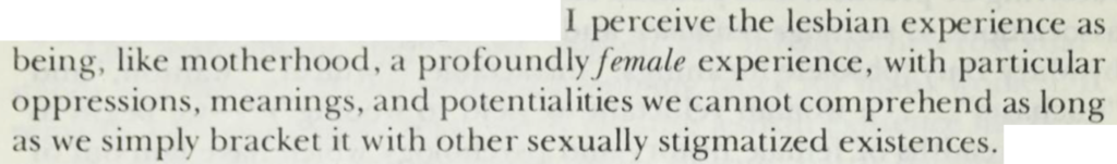 I see two problems. The first is related to sexualised intra-female intimacies. This raises an underlying fear that the visibility of intimacy between women generates a felt experience of male exclusion (if I am intimate with a woman, then I cannot or will not be intimate with a man). Second, relating the associations lesbian has with radical feminism raises some concerns about how tensions within gender debates are addressed – if lesbian, as a term, is experiences as exclusionary by some, those who do and do not identify as such are posed in defensive positions. Close readings of Wittig, Irigaray, and similar self-identified, foundational radical feminists tend to focus their work on advocating and describing the generative capacity of lesbian spaces rather than the frequently implied transphobia and trans-exclusion factors. Lesbian, as such, is felt as divisive and subsequently many folx feel excluded, if not attacked, within the communities they seek refuge in.