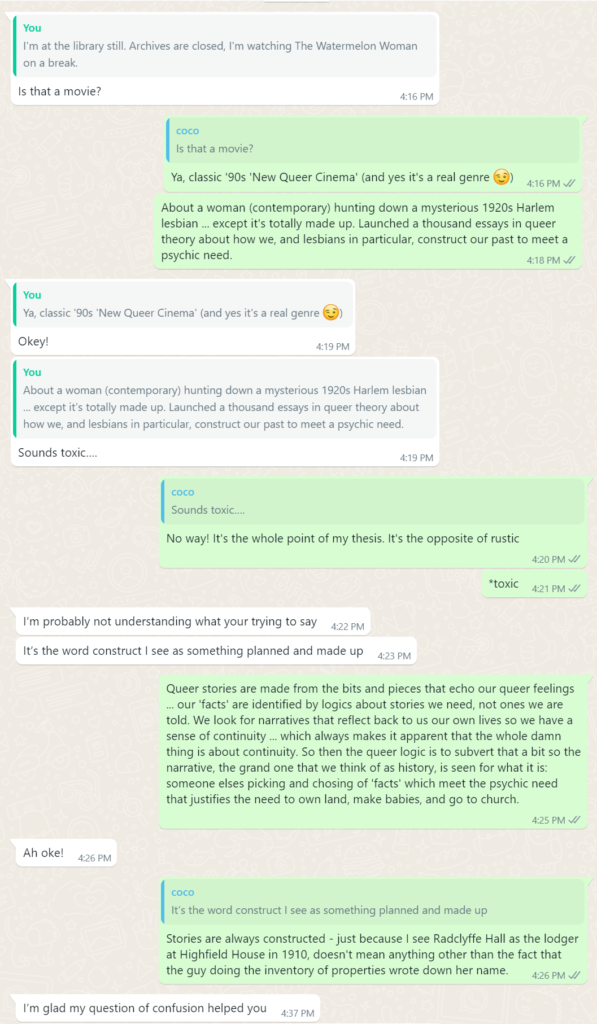 I invoke the term ‘queer’ when I don’t contextualize it – I want to claim it for my own. I feel somehow entitled, ActUp, GenX, entitled. coco is a decade younger, she grew up in Europe – does she have the context? Does she need the context? I want her to know, of course. I value her opinion. Why I, we reclaimed queer as psychic need 1Cvetkovich A (2003) An Archive of Feelings: Trauma, Sexuality, and Lesbian Public Cultures. Kindle. Durham: Duke University Press Books..