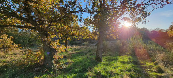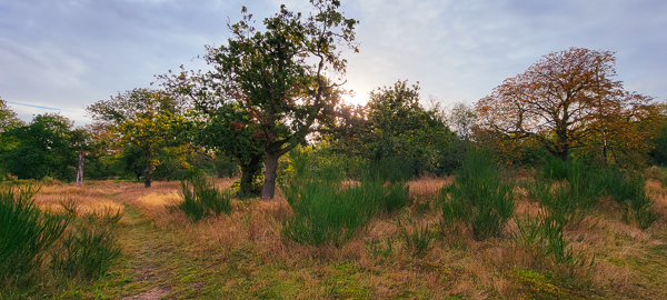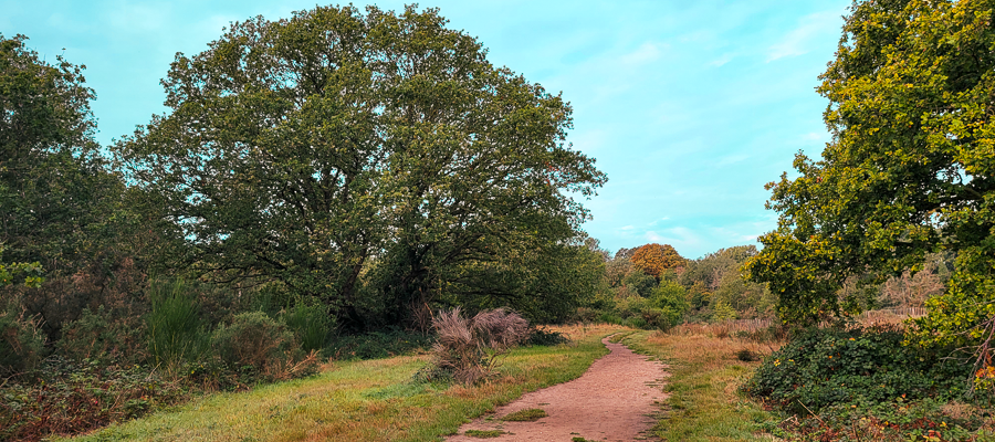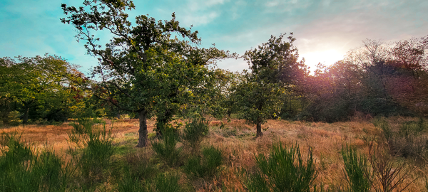 Three solitary trees, furse, and molehills greet us